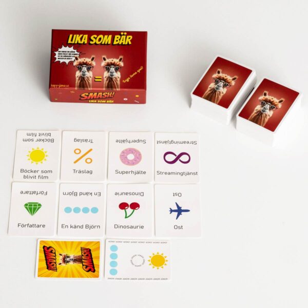 Vem i gänget eller familjen är egentligen bäst på snabba svar? Här är spelet där det gäller att både vara snabbtänkt och att hänga med i svängarna! Håll utkik efter när någon får samma symbol som dig och var först med att säga ett svar på motspelarens kort. Den första som kommer på ett svar får behålla kortet som poäng. Men se upp, det kan även komma ett smash- eller jokerkort! Samla så mycket poäng du kan inom 15-30 min!
